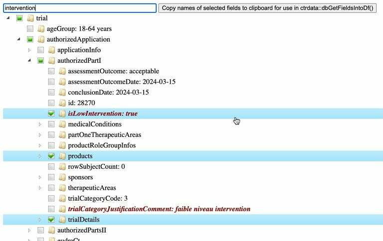 To explore the structure, field names and values of a trial from one of the registers, use function ctrShowOneTrial() in package ctrdata and go to our webapp here which provides and interactive widget such as this: